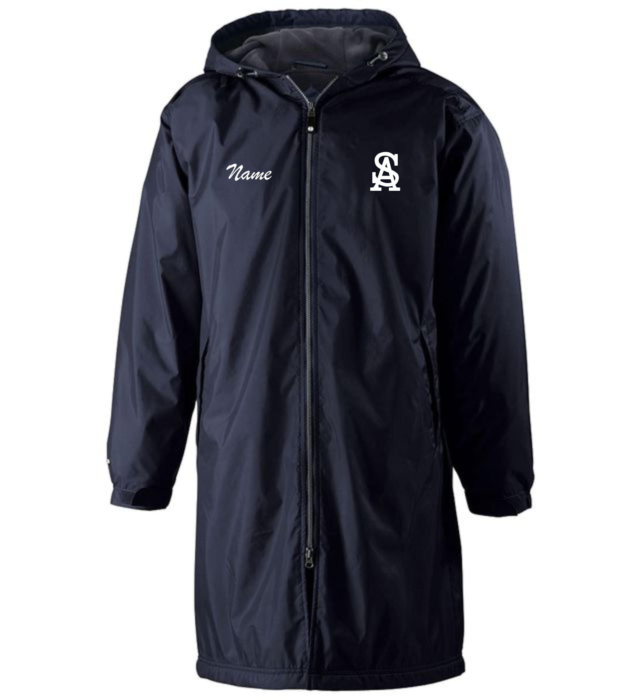 Heavy-duty team jacket with a nylon shell, fleece and quilted lining, and extended length for warmth and coverage in harsh conditions.